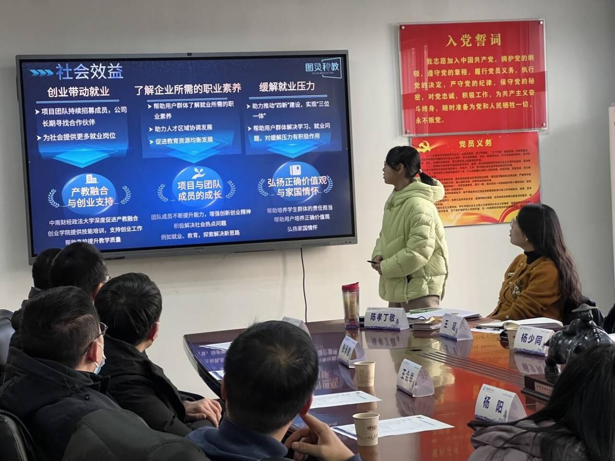 随后,仅三个月准备就获得2023年互联网+省级铜奖的图灵科教团队进行项目展示,负责人李涵展示了项目打造知识图谱为核心的课程简析系统。项目指导老师张承德老师称该项目很好的结合了二十大报告中教育数字化的切口才能抓住机会,但是仍建议项目继续落地,取得更多的科研成果。
